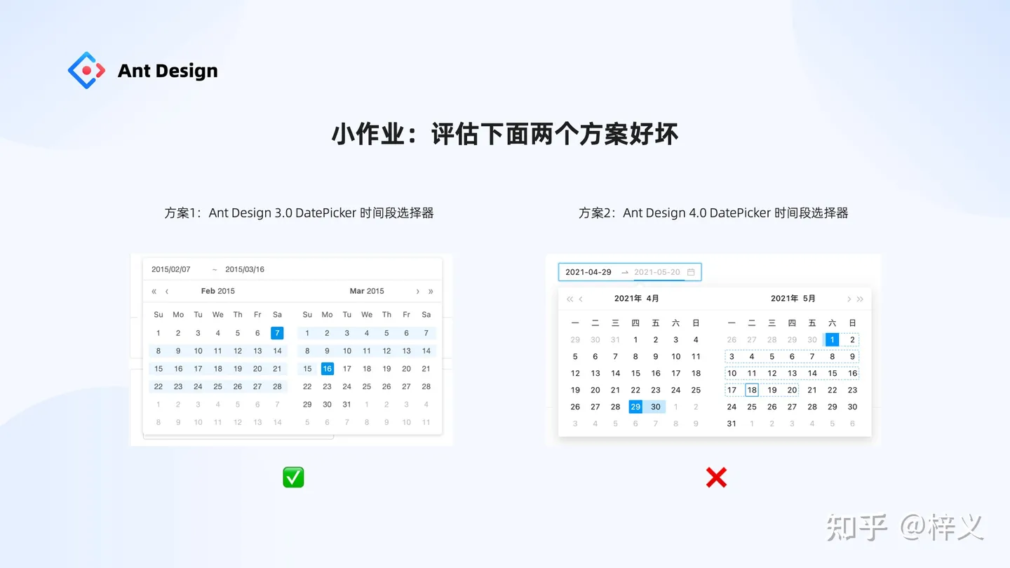 時間原因,就不再講解更多案例。這邊給大家預留一個小作業(yè),我們在 4.0 的時候升級了 3.0 日期選擇器的交互,請大家用元規(guī)范評估模型評估一下哪個方案更好?