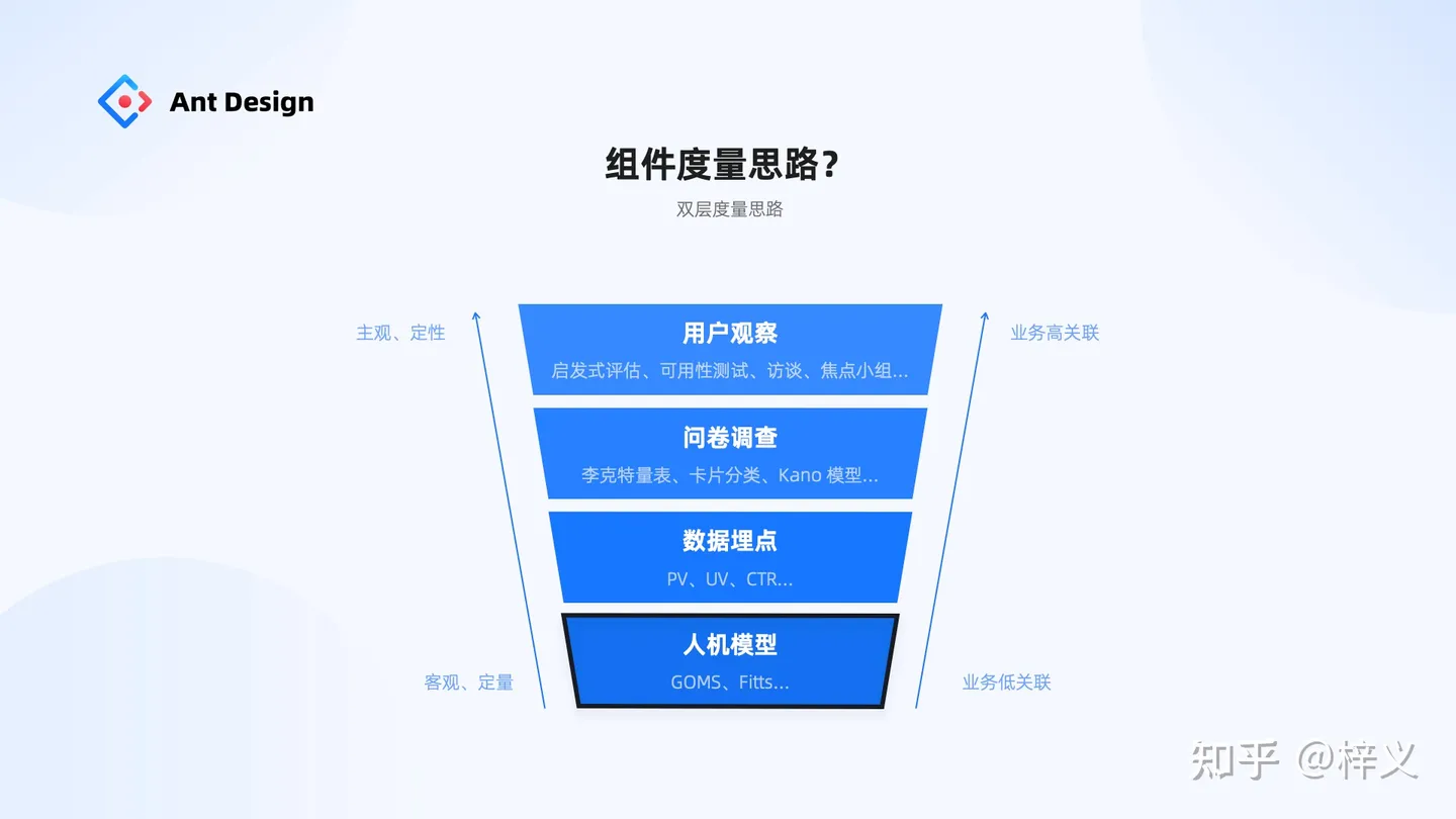 在設計研究領域,調研思路可抽象為以下幾類。第一 part 提到組件的本質是「行為的規(guī)范」,因此對組件的評估,我們同樣聚焦到如何評估「組件行為」這個本質事情上。因此我們選擇更客觀、獨立于業(yè)務的底層的人機交互模型,通過它評估而來的結果能 100% 客觀反饋交互行為的質量。