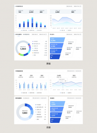 原圖中的圖表應(yīng)用有一定的問題,第一個柱狀的堆疊類型并不是太符合實際數(shù)據(jù)應(yīng)用,下方的環(huán)形圖中起始位置顯然不對,并且色彩比較混亂。