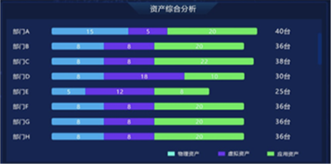 “資產(chǎn)綜合分析”模塊,以部門為單位,對(duì)企業(yè)“物理資產(chǎn)”“虛擬資產(chǎn)”“應(yīng)用資產(chǎn)”數(shù)量統(tǒng)計(jì)分析,并展示各部門內(nèi)不同資產(chǎn)類型的比例關(guān)系和總量。在設(shè)計(jì)版本中,我們改變模塊內(nèi)的布局和交互方式,以雷達(dá)圖方式展示部門內(nèi)部不同資產(chǎn)類型的數(shù)量關(guān)系和總量,并通過顏色來區(qū)分不同部間的數(shù)據(jù)。內(nèi)容擴(kuò)展性方面,采用左右橫向翻頁樣式,可自由設(shè)定系統(tǒng)自動(dòng)翻頁切換和手動(dòng)點(diǎn)擊切換,不僅豐富了頁面展示方式,又增加交互趣味性,數(shù)據(jù)切換過程中動(dòng)效的使用也進(jìn)一步增加界面的科技感和“數(shù)據(jù)之美”。